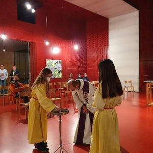 Den unfassbaren Bildern, die derzeit täglich auf den Bildschirmen das Leid der Menschen in der Ukraine vor Augen führen stehen die Gemälde der in Amerika geborenen Künstlerin Mary Fernety gegenüber. Gemeinsam mit ihrem Mann, dem Musiker Christoph Herndler lebt und arbeitet sie in Gaspoltshofen. „Burying Flowers“ – begrabene Blumen ist der Titel der Ausstellung, die mit dem Aschermittwochgottesdienst in der ansonst bilderlosen Kirche in St. Franziskus eröffnet wurde. Alte, vor allem indische Blumenstoffmuster sind der Ausgangspunkt dieser mit großer Genauigkeit immer wieder übermalten Bilder. Die Farbpalette ist sehr reduziert und mit großer Sorgfalt zusammengestellt. Neues entsteht, das die Ursprünge noch erkennen lässt - ein dynamischer Vorgang, eine Metamorphose als Metapher für die christliche Auferstehungshoffnung.